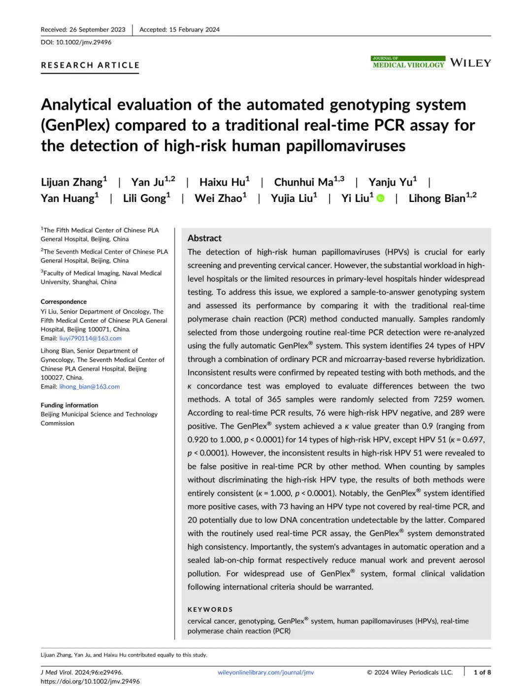 近日,中國人民解放軍總醫(yī)院第五醫(yī)學(xué)中心劉毅教授團(tuán)隊(duì)在《Journal of Medical Virology》(影響因子=12.7)發(fā)布了一項(xiàng)關(guān)于高危HPV檢測的重要研究成果,題目為“Analytical evaluation of the automated genotyping system (GenPlex) compared to a traditional real‐time PCR assay for the detection of high‐risk human papillomaviruse”。(全自動基因分型檢測系統(tǒng)(GenPlex)與傳統(tǒng)實(shí)時熒光PCR方法用于檢測高危型人乳頭瘤病毒的分析評估)。
