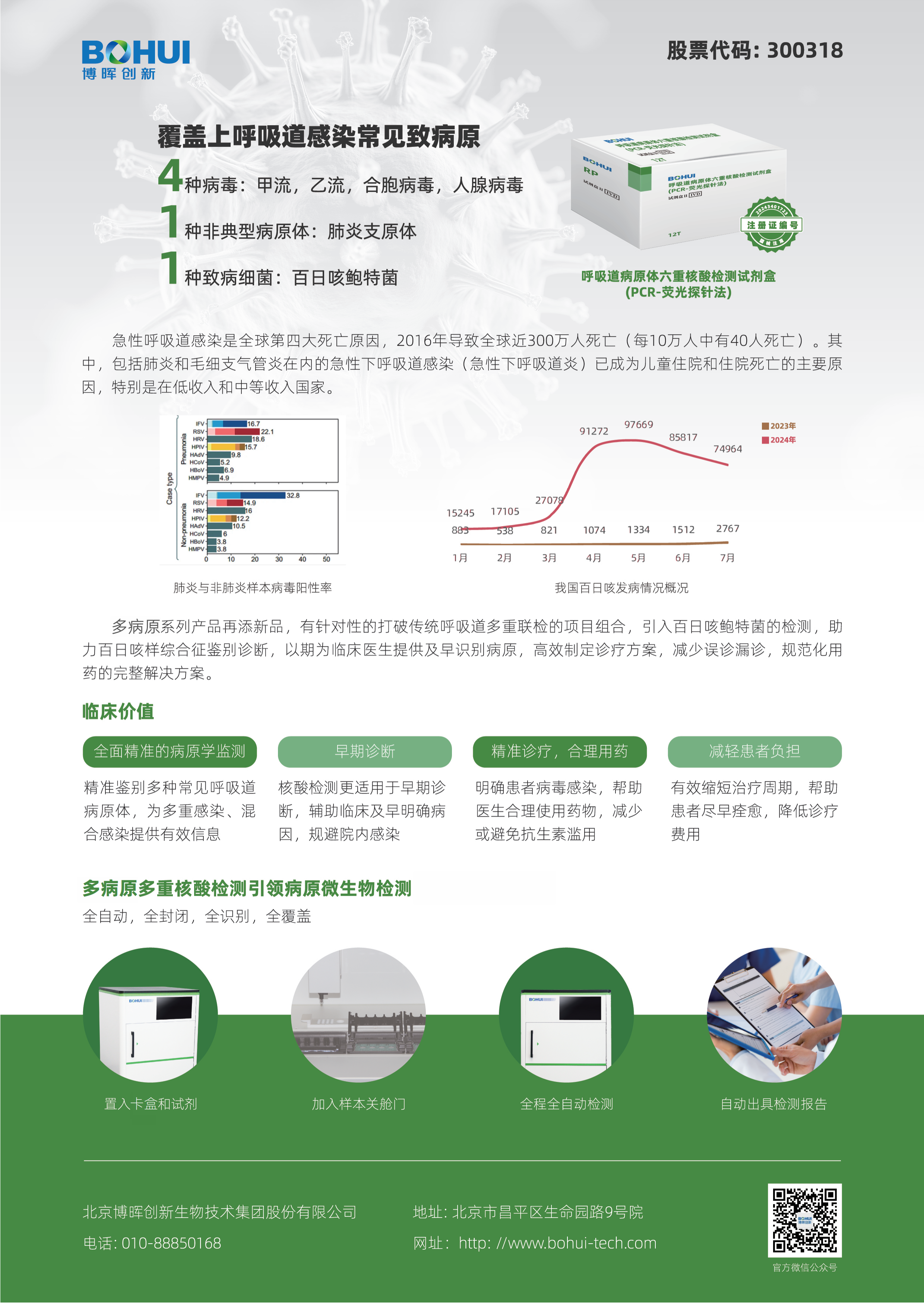 面對潛在的跨境傳播風(fēng)險(xiǎn),早期精準(zhǔn)檢測是防控的關(guān)鍵環(huán)節(jié)。博暉創(chuàng)新深耕分子診斷領(lǐng)域,推出的呼吸道病原體六重核酸檢測試劑盒(國械注準(zhǔn) 20243401723)可檢測甲型流感病毒、乙型流感病毒、呼吸道合胞病 毒、腺病毒、肺炎支原體、百日咳鮑特菌,這也是目前包含百日咳多聯(lián)檢獨(dú)家解決方案,為百日咳及常見呼吸道病原體檢測提供了高效工具。該系列試劑盒采用全封閉泵液模塊結(jié)合熒光定量 PCR 技術(shù),可實(shí)現(xiàn)全自動一體化檢測,操作簡便且結(jié)果精準(zhǔn),能快速區(qū)分百日咳鮑特菌與其他呼吸道病原體,助力臨床早期診斷、及時干預(yù)。